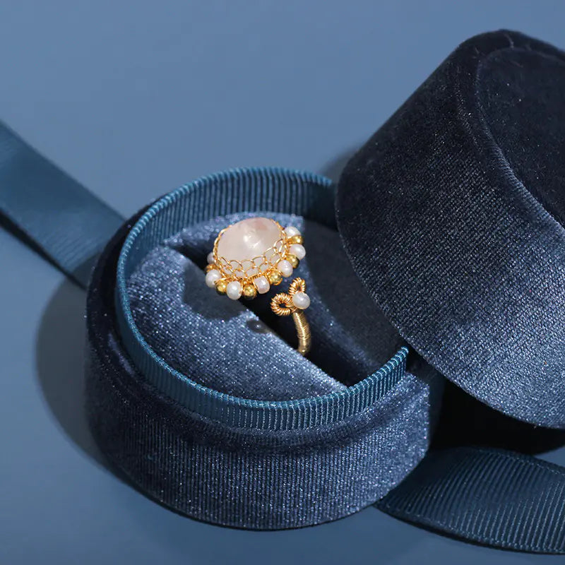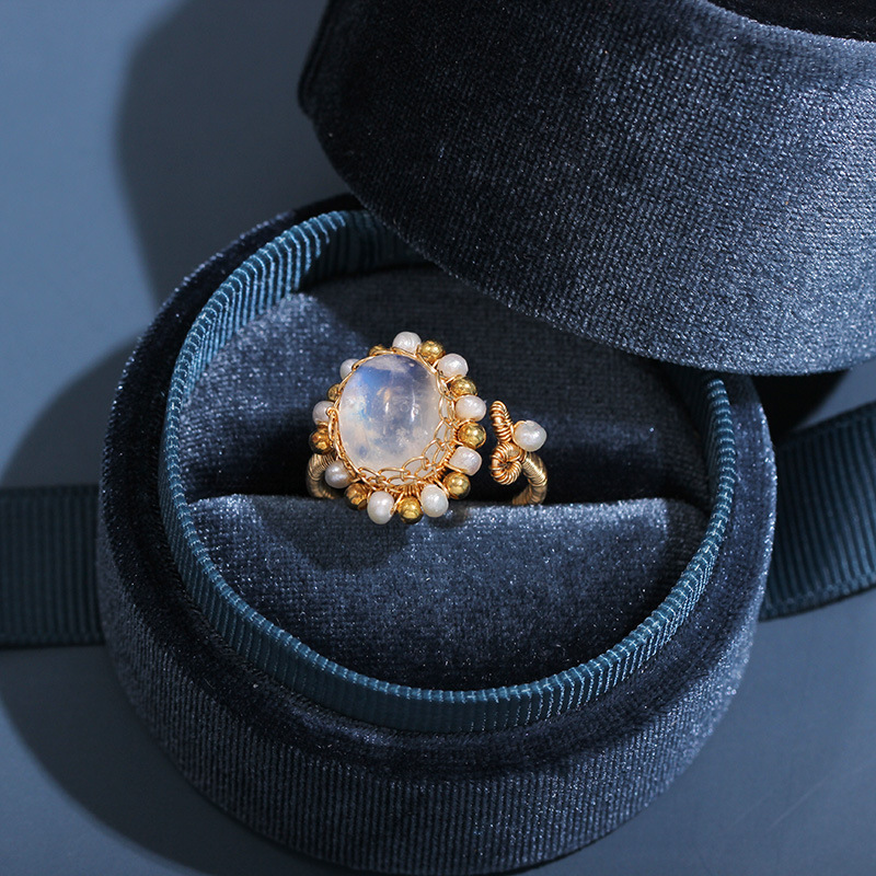 Discover the enchanting beauty of our handcrafted Moonstone Ring. This exquisite piece features a unique woven design that elegantly showcases aquamarine and stunning freshwater pearls, making it a perfect accessory for any occasion. Whether you're dressing up for a festival or looking for a chic everyday piece, this ring adds a touch of sophistication to your style.