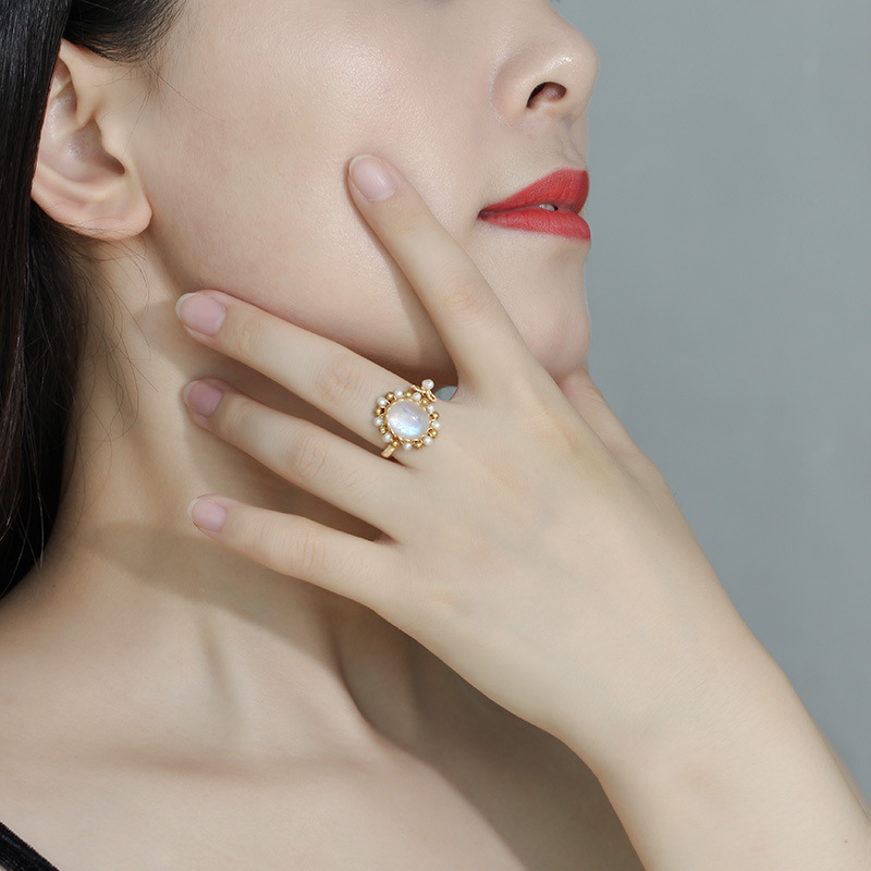 Handcrafted 14K Gold Moonstone Ring & Pearl Bracelet